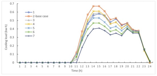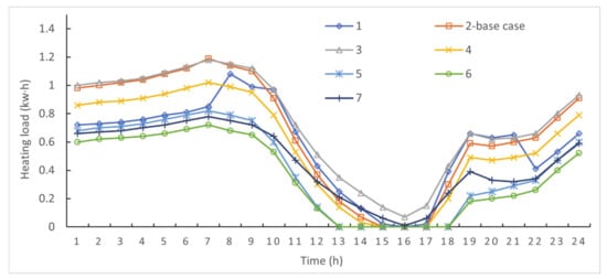 The hourly heating load and cooling load on 5 January and 31 July, the coldest and hottest days of the year, respectively, is shown in Figure 10 and Figure 11, respectively.