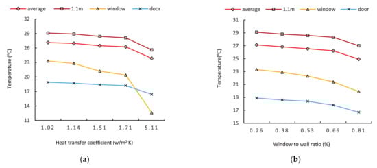 Thus, enhancing thermal insulation properties in a fixed and unidirectional manner brings about adverse consequences. To avoid the “double-edged sword” effect, it is necessary to develop and design a flexible and adjustable window structure. Under normal circumstances, the window-to-wall ratio (WWR) is restricted to ≤0.35 for residential buildings. However, excessive WWR restrictions affect the lighting and the occupant’s vision within the room, as well as other factors. Thus, using adjustable windows is significant for reducing heat loss at night and properly increasing the WWR in order to improve indoor comfort. In recent years, many buildings’ energy saving standard (ESS) has been continuously improved, from 50% to 65%, and in some cases, to 75%. In order to assess the contribution of the window’s thermal insulation to this process, it is necessary to combine some key factors, including heat transfer coefficient (HTC), electric heater power, WWR, and ESS to comprehensively analyze the room’s temperature field under different installation conditions.