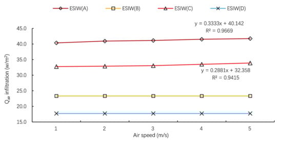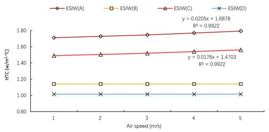 - After executing several complex simulations, the HTC and Qair in the air layer were obtained for four different ESIW windows under different outdoor air speeds. If the air speed can be obtained, the HTC and Qair infiltration can be easily calculated.