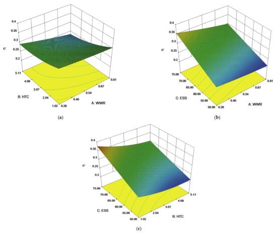 - RSM results showed that thermal efficiency was significantly affected by HTC, WWR, and ESS. The interactions between HTC and WWR, HTC and ESS, and WWR and ESS were negative, positive, and positive, respectively. The optimal thermal efficiency conditions consisted of HTC = 1.02 W/m2 × K, WWR = 0.26, and ESS = 75%.
