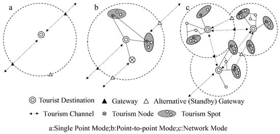 According to the formation, development, and maturity of tourist destination systems, Dredge [44] presented three spatial structure models of tourism destination: the single-node model, multi-node model, and chain-node layout model, which are in accordance with the single-point level, point-to-point level, and network-system level of the O–D system. At the single-point level, tourists come from the tourist origin to the destination and visit the only tourist node. Tourism activities are concentrated in a small range and are relatively independent, forming a single path between O and D (Figure 1a). As tourism develops, some attractive tourism resources are developed, and multiple nodes co-exist; the tourism destination model gradually changes to the multi-node layout model (or point-to-point level) (Figure 1b). With the continuous development of tourism, tourism nodes gradually increase, different types of tourist sites begin to form, and the tourist destination system progresses to a mature stage with a reasonable structure, complete function, and good stability, forming a complex network structure (Figure 1c).