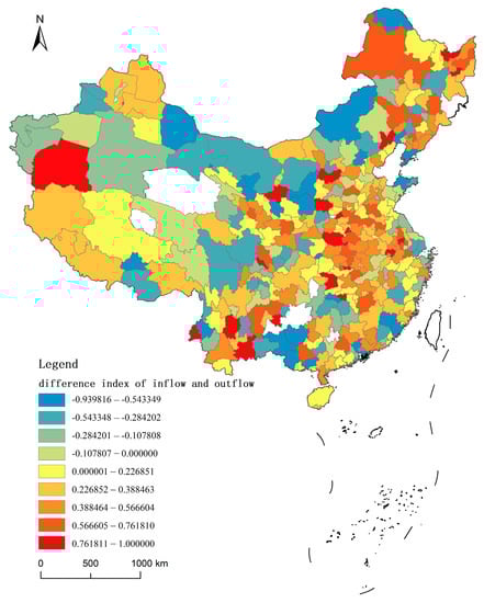 In order to further analyze the tourism flow quantity, direction, and type in each city, the amount of tourist inflow and outflow in each city was calculated (Figure 5). It can be observed that the difference index for the inflow and outflow of the tourism flow in each city is significant; regional differentiation is obvious, according to the distribution characteristics of the three zones in the eastern, central, and western parts. The cities in the east and west show more outflow, while those in the central region show more inflow. The inflow and outflow of the cities in the central and western regions exhibit larger differences. Some typical tourist cities show more tourist outflow, such as Shanghai, Guangzhou, Shenzhen, Suzhou, Zhuhai, and other cities. There are flow differences in the north–south direction for the central region; the southern cities mainly show net inflow, while the northern cities mainly exhibit outflow. This is slightly different from the population distribution pattern. There are also many cities in the remote western areas, such as Hotan, Chuxiong, and Dehong, that also have large inflow. This indicates that in tourism flow, the population flows to some cities with abundant tourism resources, which breaks the traditional pattern of population distribution. In addition, the urban economies of the eastern coastal areas are developing rapidly, their travel power is strong, and the population agglomeration effect is remarkable, which lead to the outflow of typical tourist cities being larger than the inflow, such as in Beijing, Shanghai, Guangzhou, and Shenzhen.