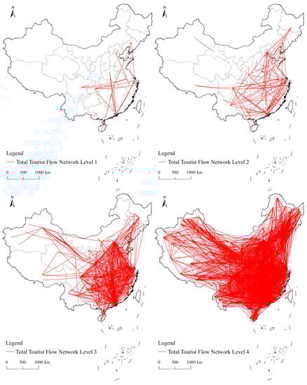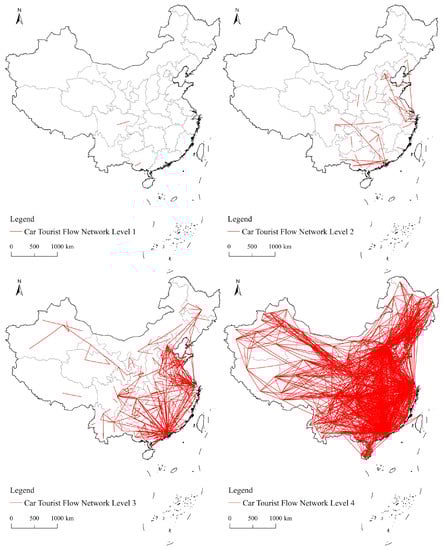 In contrast to the network pattern of tourism flow caused by air and rail transport, the tourism flow created by automobile transport is more reflected in the local tourist network pattern (Figure 9). If the balance is based on tourism flow, then the primary and secondary networks (which are not actually networked at all) are mainly connected to neighboring cities, such as Chengdu–Chongqing, Nanning–Chongzuo, Xi’an–Yan’an, and Nanning–Guilin. The network structure, density, and range are very simple. Only when the network level is reduced is the real network found, but the connected cities are mainly confined to the inner cities of the province and the neighboring province. The network density has increased rapidly, and the connectivity of major cities in various regions has increased. Some regions show plate development patterns owing to their increased network densities—such as the Beijing–Tianjin–Hebei, Shandong, Henan, Anhui, Jiangsu, Zhejiang, and Shanghai regions. The main southern urban contact network occurs from Xi’an through Yulin to Shanxi, Inner Mongolia, Sichuan, Chongqing, Guizhou, Yunnan, Guangxi, and Guangdong, with high connectivity. The network basically has each province as the basic unit, with strong spatial dependence. It can be seen that the degree of the response of road transportation to distance is stronger than that of air and rail transportation, and the regional nature of the network is the most obvious.