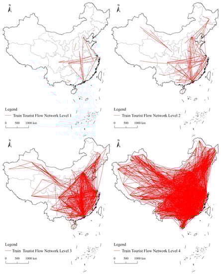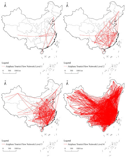 The spatial distance between a tourist destination and origin is an important factor determining the direction, quantity, and time characteristics. The transportation (aircraft or train) capacity, safety, economy, and related infrastructure configuration all further affect the network structure of tourism flow. Deasy points out that the circle structure of the tourism attraction hinterland originates from distance friction and coincides with the first rule of geography, the distance-decay regularity; that is, with an increase in travel distance and travel consumption (time and energy), the scale of tourism flow exhibits characteristics of distance attenuation [49]. The number of tourist paths, the average flow distance, and the average quantity of the four types of tourism networks were calculated (Table 2); the quantity of tourist paths and the network level form a “pyramid” structure, while the traffic-network level has an “inverted pyramid” structure; the higher the network level, the fewer the cities connected and the wider the connection range, but the greater the tourism flow. In addition to the network of car tourism flow, as the network level decreases, the connected urban pairs tend to increase, but the quantity and range tend to decrease. It means that the high-level network is not restricted by distance attenuation, while the lower-level network distance is more constrained.