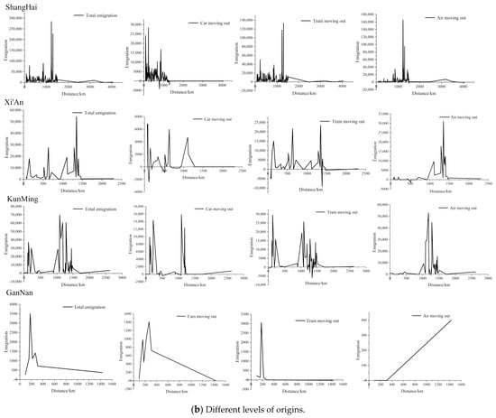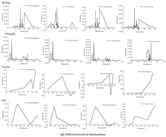 Different modes of transport have different suitable transport ranges; that is, the responses to distance are different. The automobile transport threshold is the lowest, and the response to an increase in distance is the highest, with 200 km as the inflection point. Tourism flow based on automobiles is thus drastically attenuated and overtaken by trains near 500 km, owing to their economy. The sensitivity of trains to distance is weaker, with two inflection points (or peaks)—500 km (ordinary railway) and 1700 km (high-speed railway)—but the attenuation rate after 500 km is much higher than that after 1700 km, indicating that the railways are dominated by medium-distance transportation. The aircraft transport mode has an inflection point at 1200 km followed by decay. It is because of the economic distance differences between different transportation modes that there are obvious differences in tourism flows and ranges (network patterns). In general, aircraft are suitable for long-distance transportation, corresponding to the formation of a national tourism flow network; trains are suitable for medium- and long-distance transportation, forming regional and national tourism networks; and cars are suitable for short-distance transportation, corresponding to the formation of a local tourism flow network. According to the coordinates of longitude and latitude, the distances between different levels of destinations (Beijing, Chengdu, Yan’an, and Yili) and tourist origins (Shanghai, Xi’an, Kunming, and Gannan) were plotted by using ArcGIS (Figure 10). It can be observed that the total amount of tourism flow peaks at about 1000 km, followed by a rapid decline. When the distance is greater than 1500 km or lower than 500 km, the flow is generally less, indicating that tourists have a greater desire to travel across provinces. Tourism flow has a strong path dependence on tourism channels, and the shorter the distance, the stronger the dependence on automobile transportation. The longer the distance, the more inclined tourists are to choose aircraft and railways, but in the presence of high-speed rail (especially direct high-speed rail), tourists tend to choose railways over aircraft. The functional relationship between national tourism node cities can overcome the influence of distance attenuation, but with a downward shift in the network node level, distance-induced attenuation is strengthened. For example, 63.82% and 36.18% of the Baoding–Beijing tourism flow is via train and car, with none by aviation, 96.04% of the Wuhan–Beijing tourism flow is by train, and 74.23% of the Urumqi–Beijing tourism flow is by aircraft. In the national tourism network, tourism flow is not exactly consistent with the “law of distance attenuation” but exists in a fluctuating state. When the travel force (or attraction) of the strong cities increases, tourism flow also increases; these cities—such as Changsha, Shenzhen, Guangzhou, Wuhan, Xi’an, and Zhengzhou—are also important nodes in the tourism flow network. The emergence of high-speed rail has broken the monopoly of long-distance transportation by air and affected the differentiation of urban networks. The national and large regional networks formed by a reliance on air transportation are being impacted by the high-speed rail network; that is, reliance on the high-speed railway network is able to construct regional and even national urban networks. For road transport with relatively weak time sensitivity, it is difficult to scale it up to large regional networks.