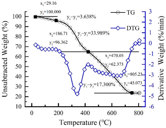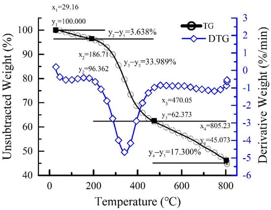 The curve of the pyrolysis of carbonaceous deposit can be divided into three regions according to the shape of the curve: region I, with temperatures below 200 °C; region II, with temperatures of 200–470 °C; and region III, with temperatures of 480–800 °C. In regions I and II, the shape of the curve is similar under different conditions, which means that pyrolysis was the main reaction that occurred below 480 °C, as shown in Figure 1 and Figure 2. In region III, the rate of matter loss showed by the derivative thermogravimetric (DTG) curve in Figure 2 is much higher than that in Figure 1, which indicates some components can be oxidized to gas in this region.
