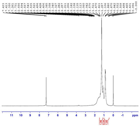 In our previous study [], the organic component of this deposit had been analyzed by Fourier transform–infrared (FT-IR) spectrometry. The results showed the strong absorption of methyl (-CH3-) and methylene (-CH2-) at 2800 cm−1 to 3000 cm−1 and 1300 cm−1 to 1500 cm−1, respectively. The 1H-NMR spectrum shown in Figure 3 was used to furtherly analyze the structure of the organic components by detecting the position of the hydrogen.