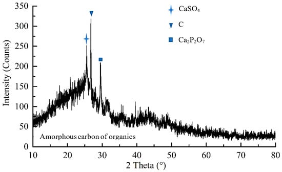 Figure 4 further provides more insight in the analysis of the inorganic matter in the deposit. It shows an obvious background at 10°–30°, caused by amorphous organic matter. The characterization of the complex composition of the deposit is also reflected by the disordered and irregular shapes of the peaks. The sharp peaks at 25.5°, 26.7°, and 29.5° (2θ) are assigned to anhydrite (CaSO4), graphite (C), and calcium pyrophosphate (Ca2P2O7), respectively, based on the elements contained in the carbonaceous deposit. It can be found that the inorganic components were mainly additives in fuel or lubrication oil and crystalline carbon, which reflects the origin of the inorganic matter contained in the carbonaceous deposit. This also suggests that there was some crystalline carbon (C) contained in the carbonaceous deposit originally.