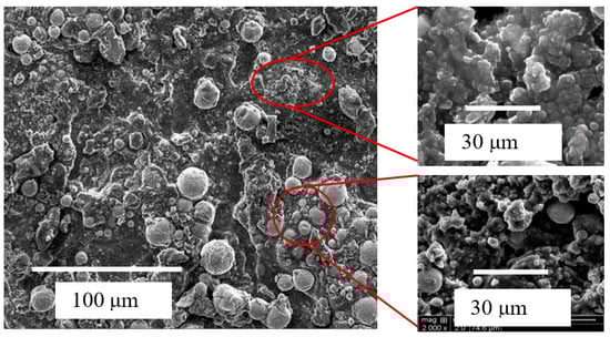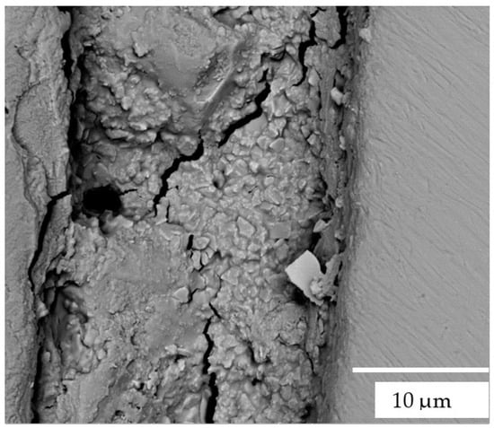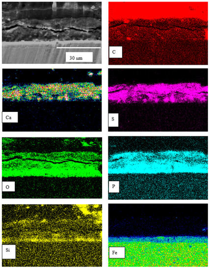 The cross-sectional micromorphology and element content variation from the interior to the surface as detected by the EDS surface scanning of the carbonaceous deposit is shown in Figure 5. The figure shows the synchronous content variation of iron and oxygen in the inner layer, which indicates that the iron oxide (generally called the denaturation layer) was produced before the contaminant was deposited []. It appears that the denaturation layer, which acts as a layer for the attachment of the carbonaceous deposit, plays a vital role in the formation of the carbonaceous deposit. As the carbonaceous deposit attached to the denaturation layer, the carbon content did not clearly increase synchronously. However, at the surface, the carbon content began increasing, indicating that the organics mainly covered the surface of the deposit and were not evenly distributed in the whole deposit layer. Instead, the inorganic components showed relatively higher content in the inner layer. The micromorphology observed at high magnification in Figure 6 shows that the inner deposit comprised both organic and inorganic matter. This is because the high temperature in the engine is not conducive to the deposition of organic matter, and only a small amount of organic matter, protected by inorganic particles, remained. Therefore, the inner part of the deposit is very stable and cannot be easily removed.