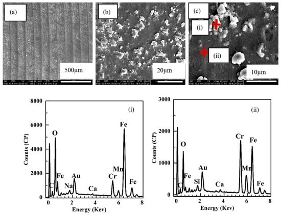SEM images from the surface of the carbonaceous deposit after molten-salt cleaning. (a) With 100× magnification, (b) with 2000× magnification, and (c) with 5000× magnification, (i) elemental composition of point (i), (ii) elemental composition of point (ii).
