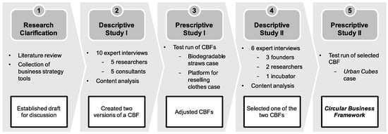 The Design Research Methodology (DRM) offers a useful approach to the research task because it “helps plan design research by providing process steps; and improves the chances of obtaining more valid and useful outcomes” [] and has been adapted for various applications, including some specifically focused on the CE [,,]. Figure 2 illustrates the different stages that led to the novel Circular Business Framework and that are further explained in the following sub-chapters.