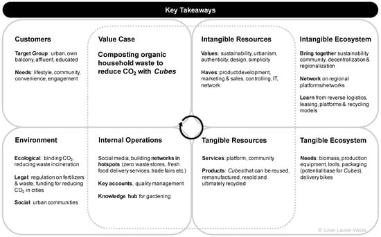 To test their BM and come up with new ideas for increasing their adherence to CE principles, the two founders agreed to using the Circular Business Framework in a provisional workshop setting. After one thorough iteration, they found the framework to be especially helpful during the early stages of BM development to structure ideas and identify gaps. Its design as well as the supporting materials were received positively, and the workshop yielded several impulses and ideas for optimizing their circular design as well as their material loops. All three requirements that were derived from the potential uses of the framework in Section 3.3 were addressed by the supporting materials as well as by the guiding questions, which were also received positively. Some (redacted) results from the application of the CBF during the workshop in the PS-II stage can be seen in Figure 4 using the template for presenting key takeaways of the process.