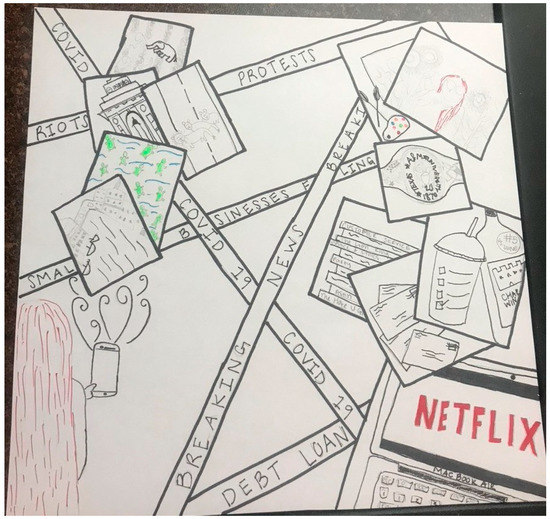 A Zoom session was offered to discuss the drawing and help FRAME the task. A subsequent task following this exercise a week later was to engage with some aspects in the textbook to further facilitate thinking and reflection on their original drawing and writing, and to re-do the drawing and writing. Readings included healing from art in post-disaster context [41]. Six essays and drawings are presented below, along with some themes, insights, and reflections that offer glimpses of DWK as the students struggled to name and frame a pandemic experience, the strategies they developed to cope (one went on a road trip), and what it meant to their daily lives and studies and careers. The six students described below provided consent for their drawing and writings to be used within publishable articles and are illustrative of how DWK offers a powerful way to facilitate empathy, reflection and relating to a highly complex situation (a wicked problem of a new virus escalating a global pandemic). Students’ reflections and drawings demonstrate how they felt, the ways in which they coped, as well as their hopes and aspirations for the future. Quotes bring their voices to their diagrammatic art object and illustrate reflexive and emotional engagement and sense making during this unprecedented’ pandemic moment, a highly difficult, complicated, uncertain time of social isolation and shelter in place with little clarity on future directions [21,22]. Figure 1 illustrates various activities being undertaken through snapshot images, like scrolling through a social media feed. Note the environmental images with clean water, the “virtual” engagement with online shows like Netflix, as well as the pile of books, the class ring, and the wine and coffee.