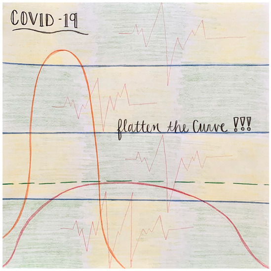 Each of the six students mentioned within their essay that they specifically used their own experiences around COVID-19 when creating their drawings, and two of them also stated they felt strong emotions when writing their papers, using their papers to “vent frustrations” and “wrap [their] heads around” their different, personal experiences of COVID-19, with several of them being furloughed from their jobs (two within hospitality) during the pandemic. Nonetheless, they understood the urgency to “flatten the curve” (Figure 2).