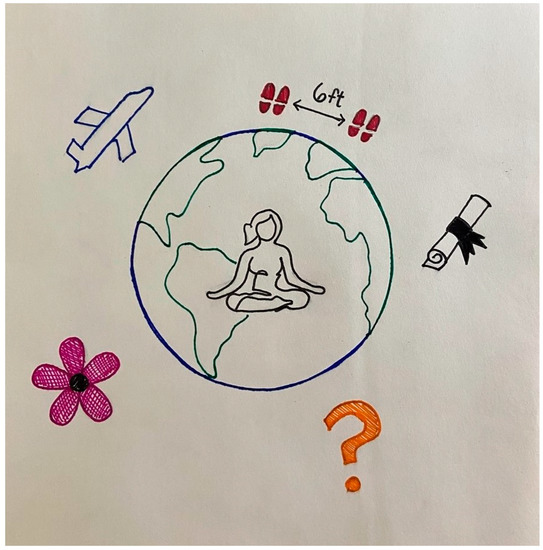 I drew a picture of a women meditating in the center of the Earth. Meditation is all about relaxing and focusing on the things that you can and cannot control. The women in the middle represent me and my personal journey with COVID-19. The recent pandemic has altered my life in many ways including my social life, my school and career, and has left many uncertainties. However, it has also helped me grow in ways I would not have imagined. That is what this picture represents to me. (Student’s one-paragraph description accompanying the drawing).