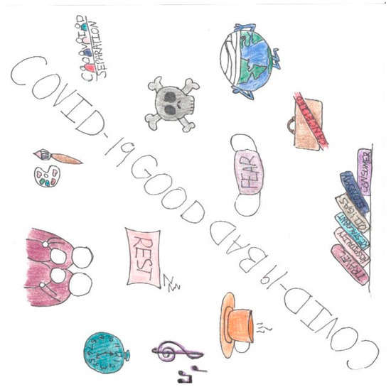 During the Summer (June) 2020 academic session, a creative writing assignment was co-developed by the instructor and a graduate student and administered to 22 students in a five-week, intensive, online international tourism impacts course at a US university. The course was oriented towards justice and ethics, responsibility, sustainability, and well-being (both individual and communal), as key principles in tourism development. Students read articles and cases on diverse communities, regions, and destinations which illustrate both benefits and inequalities, misrepresentation, dependency on modernist development paradigms as well as approaches to reach communities with responsibility and care (e.g., [39,40]). The exercise contained a writing and drawing dimension with dual aim: (i) to understand student experiences of disruptions caused by travel restrictions and shelter in place rules that transformed their college town into a remote learning facility with quiet streets, and (ii) to facilitate reflection and sharing of experiences through a creative design process where students sketched and described their feelings and experiences since the pandemic was declared on 11 March 2020, disruptive their lives, livelihoods and studies. Past research of public engagement with local art and their artists in post-disaster contexts reveals, for instance, opportunities for communal healing and solidarity [40]. The 1000–2000 word writing and creative drawing assignment provided two options: (a) Create one art drawing and writing reflection of their experiences and perceptions of COVID-19, or (b) Create one art drawing and writing reflection of their perceptions and experiences of how COVID-19 is affecting climate change. A one-paragraph description to accompany (frame) the drawing was also requested.