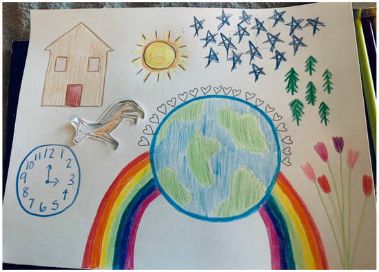 Two students mentioned that the assignment showed them how they express their emotions through crafting and drawing on a regular basis, and this assignment reinforced that. The other four noted that they also felt a release of emotions through the creation of this drawing and writing assignment. While none used the exact phrasing, each student’s essay had a paragraph or so where they all spoke about how they worried about their families, friends, and even people they do not know (note the love for the planet in Figure 6). Many expressed empathy for others, and noted that people were joining together to “do something so simple to save the lives of others” like self-isolating and wearing masks, and how “powerful” and “beautiful” that was to them. The students note that even though every person has lost so much, whether they lost trips and experiences, or family and friends, people were still able to join together in the hope they were saving the lives of others. This show of empathy was unanimous across all six essays, with phrases such as “protecting our loved ones”, “listening to [my] brother’s and mother’s struggles and pain…broke me knowing I could not be there with them”, and “the death[s]…weigh heavy on my heart for families I personally know and those I do not”. Empathy was encouraged during and after the assignment, allowing further discussions of their drawings over Zoom if they wanted, feedback on their writing and drawings, encouraging critical but empathetic thinking through further readings, such as the article on communal healing through art.
