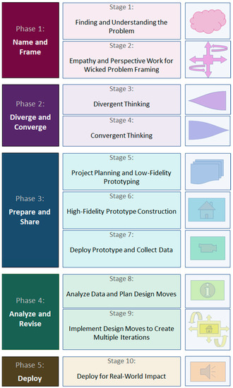 In the revised DTEL model, the design thinking process involves five phases broken down into ten stages (Figure 8).
