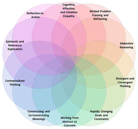 In academic settings, learners become habituated in a modality of thinking from concrete to abstract. Therefore, they may need scaffolding in developing the Working from Abstract to Concrete designerly way of knowing. This issue is compounded by traditions in academia in which knowledge is often depicted as abstract entities, and learning as acquisition of knowledge [48]. In the Learning Sciences, learning is often described as individual, collaborative, and collective construction of knowledge [65]. Therefore, engaging learners in Working from Abstract to Concrete goes hand-in-hand with Constructing and Co-Constructing Meanings. Helping learners develop skills in Contextualized Thinking, along with Epistemic and Relevance Exploration, may broaden their epistemological assumptions to go beyond norms in academia they may have become enculturated into such as prevalent beliefs that quantitative studies produce more valid findings due to an assumption that generalizability should be the goal of research [66]. These problematic norms and assumptions in academia contribute to epistemic homogeneity and reproduction of epistemic injustice, but developing the designerly ways of knowing of Epistemic and Relevance Exploration, Contextualized Thinking, Constructing and Co-Constructing Meanings, and Working from Abstract to Concrete may facilitate habits of mind which can serve to counteract the suffering caused by such norms and assumptions [67]. However, these are generally cognitive processes. A more holistic and balanced approach is introduced through the development of the Cognitive, Affective, and Conative Empathy designerly way of knowing which focuses the designer on analytically and emotionally understanding the ways in which people—especially historically marginalized or op-pressed people—experience the problem for which they are designing, and the ways in which solutions they design may be experienced [68]. This is especially powerful when combined with the Reflection-in-Action designerly way of knowing [43].