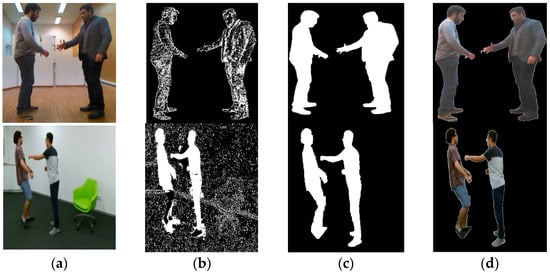 Background subtraction over RGB image sequences of UoL and NTU RGB+D dataset: (a) original image; (b) subtracted frame at T = 1.5; (c) binary silhouette obtained after adjusting T; (d) RGB silhouette.