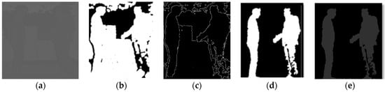 Morphological operations on depth images. (a) Original image; (b) image after erosion and dilation; (c) edge detection; (d) binary silhouette and (e) depth silhouette.