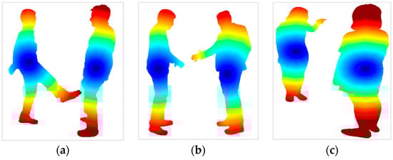 In this feature, actions between two interacting humans are represented via geodesic wave maps. These maps are generated by calculating the geodesic distance (the smallest distance) which is found by a Fast Marching Algorithm (FMA) [74]. Firstly, the center point s of the two human silhouettes is located and given a distance value d (s) = 0. Point s is the starting point and it is marked as a visited point. All the other pixel points p on human silhouettes are given a distance value d (p) = ∞ and are marked as unvisited. Each unvisited point p is taken from the neighbors of s and its distance from s is measured. In this way, each neighboring pixel is taken in each iteration until all the pixel points are marked as visited. The distance calculated at each iteration is compared with the distance of each previous iteration. A priority queue is generated where the shortest distances are given priority [75]. An update in distance is defined as: