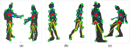 Figure 6. Eight upper body angles (shown with blue-colored lines) and six lower body angles (shown with yellow-colored lines) formation over (a) giving object; (b) walking apart and (c) kicking action classes.