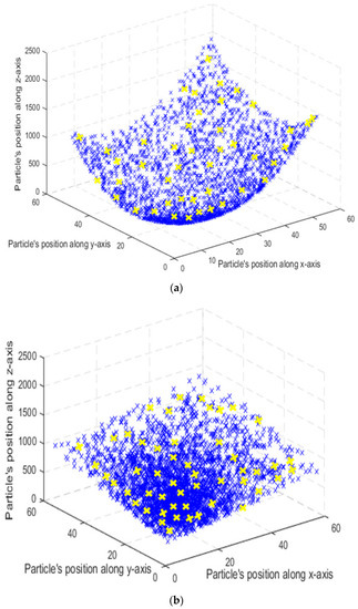 Movement of the swarm particles (shown in blue color) towards global best positions (shown in yellow color) after applying Particle Swarm Optimization (PSO) on action classes of (a) the NTU RGB+D dataset and (b) the UoL dataset.