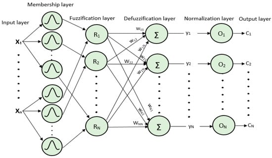 In order to accelerate the recognition rate of human actions, NFC, i.e., the hybrid of fuzzy set theory and Artificial Neural Networks (ANN) is applied. This hybrid classifier results in an intelligent inference system which is capable of both reasoning and self-learning [84]. Many action recognition systems based on NFC have been proposed in recent years [85]. This is a six-layer architecture, as displayed in Figure 9.