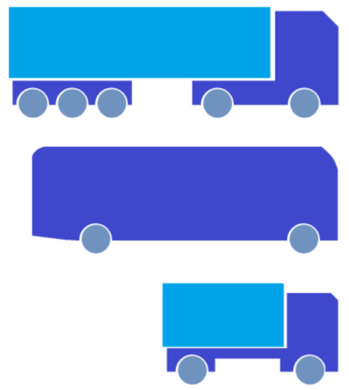 Three HDVs were tested on the road for the purposes of the present study. The tested vehicles belong to different HDV categories: Vehicle 1 is a heavy lorry (tractor with semi-trailer), vehicle 2 is a heavy bus (coach), and vehicle 3 is a medium lorry (rigid truck). Figure 1 shows an illustration of the vehicles and their technical specifications are listed in Table 1.