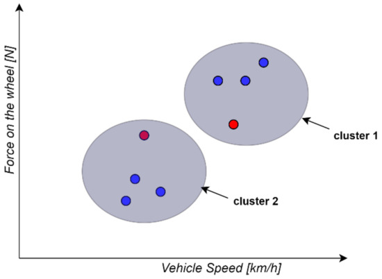 Until this point, there is filtering inside each steady speed segment, but there is no interaction between the different ones at different speeds. It has been observed that the average force value of a steady speed segment can be unrealistic compared to the average value of a steady speed segment in a lower or higher speed. For this reason, extra filtering of outliers is applied, in which the average power values in the whole velocity range of the trip are grouped in velocity clusters. For that reason the K-Means clustering method is applied [32]. From each group, the values that fall outside one standard deviation from the median are removed. A schematic simple example is presented in Figure 3.