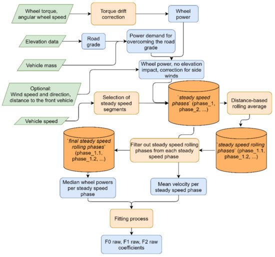 Then the fitting process follows with the aim of deriving the raw road load coefficients. The data passed to the fitting contain the median values of steady speed rolling segments of each steady speed segment. The measured power is at the wheel, so there is no impact from drivetrain losses. For this reason, resistances related to the first power of velocity (F1 coefficient from Equation (1)) are limited to the range of ±0.1, to account for any small influence of the rolling resistance and air drag related to the velocity. Additionally, weights are added to the fitting of the points to determine the uncertainty of the force values (1-dimension sigma parameter as defined in [33]). According to the weights, priority is given to the most robust force values, in the case that 2 (velocity, force) pairs have close velocity value but not realistic difference in force. The weights are produced as the product of the standard deviations of force, velocity and altitude, and the average speed of each point. The procedure up to this point is summarized in Figure 4.