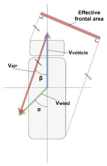 where the coefficients α1, α2, and α3 are defined according to the vehicle segment, and they indicate the change of the vehicle area vertical to the wind speed vector. A schematic example of the vehicle effective frontal area that is considered according to the β is shown in Figure 5. The cross winds during a test can have a significant impact for the HDVs where the effective area, depending on the yaw angle, can change dramatically, increasing the Cd·A product up to 3 m2. For this reason, the same approach was adopted for vehicle 1 where the yaw angle was measured, correcting the instantaneous measured wheel power for the impact of the yaw angle according to Equation (13).