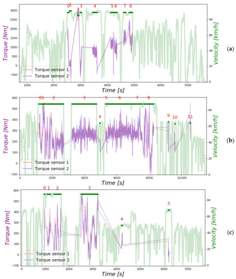 Examples of test types: (a) Combination of urban, rural, motorway; (b) motorway; (c) urban. The readings of torque sensor signals (light red and blue) refer to the left y-axis. The readings of the vehicle speed signal (light green), and the steady speed segments (dark green) refer to the right y-axis.