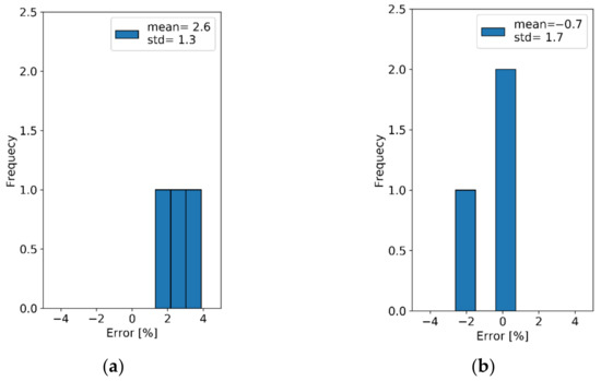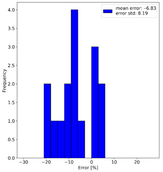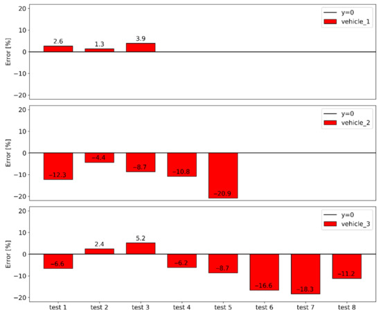 The underestimation in vehicles 2 and 3 results in a total average error of −6.8%. The reason for the increased total average error might be that in public roads HDVs are obliged to limit their speed and have limited possibilities to overtake other vehicles. This can result in a car-following scene that lowers power demand from the vehicles. The validity of this assumption will be evaluated through the fuel consumption comparison. Unfortunately, a distance-to-the-front signal was not available during the tests for vehicle 2 and 3. For vehicle 1, there were few cases were the distance to the front could impact the results, so there was no correction according to the distance-to-the-front performed. Taking into account all the factors that can impact the results, the standard deviation of the error for all the tests of approximately 8.2% is considered satisfactory. Considering the tests performed per vehicle as one set of tests, the pooled standard deviation is 7%. The distribution of the error is presented in Figure 8.
