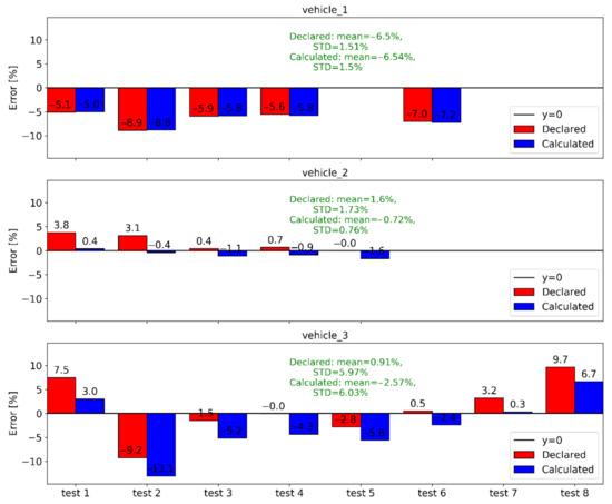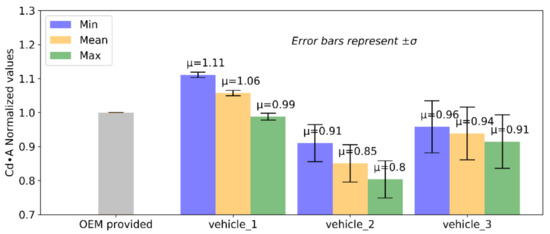 Figure 7 shows the error bars of the Cd·A value using the RRC values declared by the respective vehicle OEMs, as reported in Table 5. The error formula is defined as: