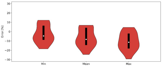 Violin plots for the total error distribution using the min, mean, and max RRC values of the tire efficiency classes. The white dots refer to the median values, while the thick black line corresponds to the range of the first to the third quartile.