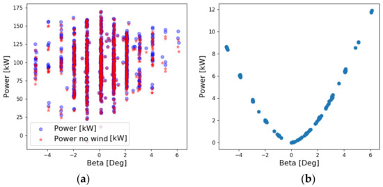 Wind correction example for a constant speed segment with 91 km/h average speed: (a) Power points before and after yaw correction; (b) power correction versus beta angle.