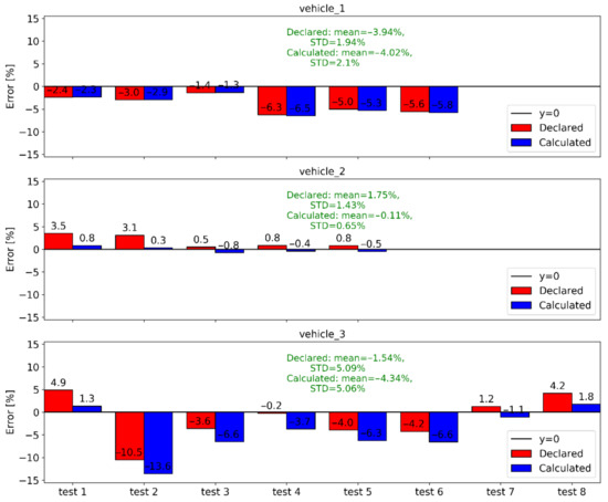 Overall results, all tests of all tested vehicles are presented in Figure 15. The mean error values for the fuel measured and the wheel work are −1.4% and −1.0%, respectively, when using the declared Cd·A of the vehicles. These errors are closer to zero errors compared to the calculated ones since the latter give a mean error of −3.1% and −3.2% for the fuel and the wheel work, respectively. This additional 2% of underprediction of fuel consumption and wheel work by using the calculated Cd·A is not corresponding to the almost 7% underprediction of the declared Cd·A values by the calculated ones. This can be explained by the fact that the calculated Cd·A values in some real-world tests can produce more representative road loads than the declared ones, resulting in better agreement in the wheel work and fuel measured (e.g., vehicle 2). This can also be supported by the slightly lower standard deviation of the calculated Cd·A, which, in addition, is a good sign of the stability of the methodology. Another factor to account for is the share of high-speed segments, where the aerodynamics have a major contribution to fuel consumption. However, no connection was found in the presented study.