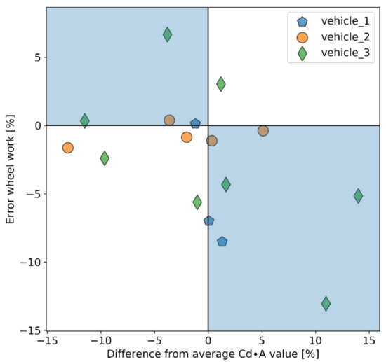 Finally, in Figure 16, we compare the wheel-work error obtained by VECTO simulations with the percentage difference between the average values used in the simulator and the Cd·A values calculated by the individual tests. A test Cd·A value lower than the average value used in the simulations would lead to an overprediction, while a higher test Cd·A than the average would lead to an underprediction of the wheel work. Although this trend is visible in most of the values (the expected region of the dots is colored in light blue), the correlation is low for vehicles 2 and 3, as calculated with the use of R2 metric. More details are provided in Table 10.
