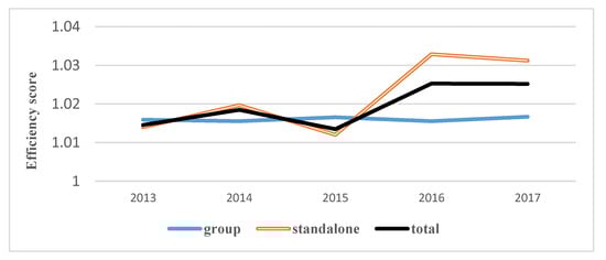Figure 1 shows the average efficiency scores of 124 airports divided into two types: 79 standalone airports and 45 group airports. As shown in Figure 1, from 2013 to 2017, the red double-lined curve of the standalone airports rises and exceeds the blue curve of group airports, which indicates that the efficiency of standalone airports worsens compared to that of the group airports. The efficiency score was calculated under the output-orientation assumption, meaning that the degree of inefficiency increases as the efficiency score value increases.
