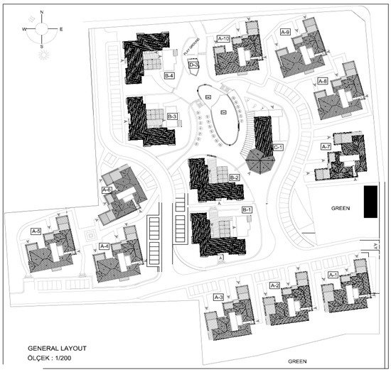 This retrofit focused mainly on the heating, cooling, and hot water system within the housing stock. The general architectural plan/layout for this community is presented in Figure 2. The community consists of both residential and commercial apartments. It also has a central building (housing for administration offices) and a restaurant. The residential apartment consists of 30 units of 2-bedroom apartments and 20 units of 3-bedroom apartments. The commercial apartment (hotel) consists of 16 units of 2-bedroom apartments and 20 units of 1-bedroom apartments. The commercial apartments are mostly occupied by tourists who are on a long-term vacation in the country.