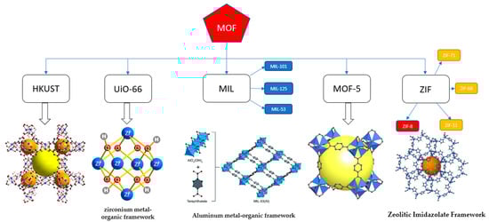 Schematic representation of varying classes of widely-used MOFs. MOF (metal organic framework); HKUST (hongkong university of science and technology); UiO-66 (Universitetet I Oslo); MIL (Matériaux de l′Institut Lavoisier); ZIF (zeolitic imidazolate framework).