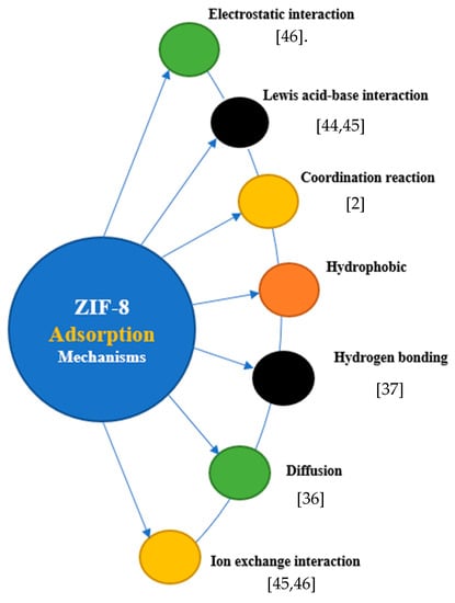 In many cases, there will be more than one mechanism responsible for the high adsorptive capabilities of ZIF, such as diffusion, hydrogen bonding, and electrostatic interactions [,,,]. In a study by Begum et al. [], the surface of ZIF-8 was positively charged because =N−, −NH− and −NH2 groups of imidazolate ligands were protonated in an aqueous system, which provided an electrostatic interaction for Cr(VI) for adsorption. The bonding of hydroxyl groups to zinc and the presence of GO and Mg (OH)2 also strengthened interactions with Cr(VI), further reducing it to Cr(III), partially. In addition, Mg2+, which was positively charged, coordinated with oxyanion, triggering chemisorption, and provided a platform for species adsorption []. Zhou et al. (2019) also investigated the use of ZIF-8 for simultaneous removal of mixed contaminants, e.g., copper and norfloxacin from an aqueous solution. They obtained a high removal efficiency of 95.4% and 80.3% for copper and norfloxacin, respectively. Nevertheless, they noticed that the adsorption mechanism for the mixed contaminant was mainly due to the ion exchange for Cu (II) adsorption, whereas electrostatic interactions, π-π stacking between the imidazole ring of ZIF-8, and the benzene ring in norfloxacin were responsible for norfloxacin adsorption []. Hence, depending on conditions and constituent of wastewater, surface functional groups, surface charge, and coordination strength, one or more mechanisms may be found to interplay in the removal mechanism. In an experiment by Jian et al. [], the ZIF-8 adsorption of arsenic from aqueous solutions was mainly controlled by pore diffusion (intraparticle diffusion), similar to the results of Huang et al. []. However, it is important to state that the effectiveness of these mechanisms is controlled by critical operating conditions such as pH, temperature, contact time, and adsorbent features [].