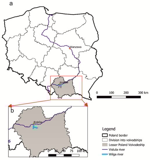 The location of the Wilga River on a map of Poland (a), and in the Lesser Poland Voivodeship (b).