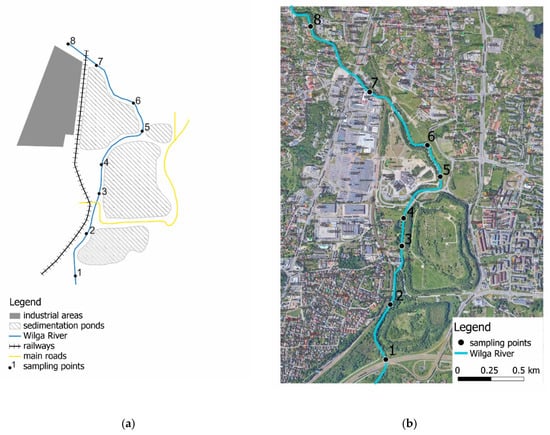 Fragment of the Wilga River on the plan of sedimentation ponds (a), and on the Krakow city plan (b) with locations of sampling points.