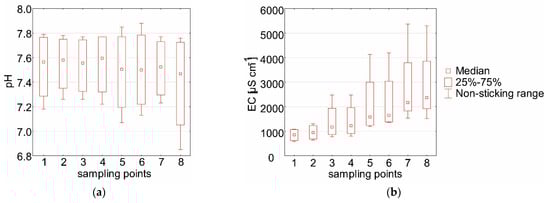 The EC value at each point was the highest in the autumn (Figure 4b). According to the Regulations of the Ministry of Environment in Poland (RME) [], the permissible EC value qualifying water as having good quality is ≤ 677 µS cm−1. However, a high EC value (i.e., EC > 1500 µS·cm−1, indicating salinity) was found in every season at sampling points 7 and 8. This level was more than twice the acceptable limit (Table 2).