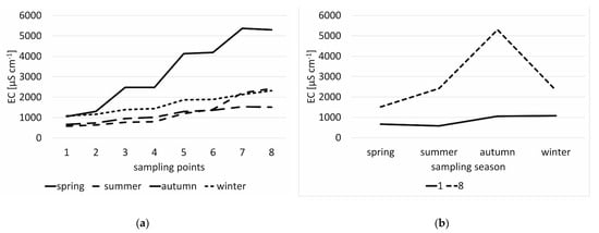 Values for electrical conductivity (EC) at sampling points (1—before entering the sedimentation ponds area and 8—after flowing through the premises of the former soda factories) (a) and the EC values by season (b).