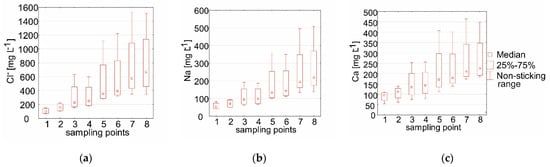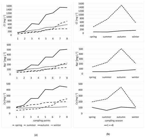 The values for sodium (Na+), chlorine (Cl−), and calcium (Ca) followed a trend similar to that of EC. They increased at subsequent measuring points as the river passed the sedimentation ponds (Figure 5a–c and Figure 6a and Table 2). Moreover, the values for all of them (Na+, Cl−, and Ca) were always significantly higher in autumn than in the other seasons (Figure 6b, Table 3). The value for Cl− was 44.8 mg L−1 at points 5, 6, 7, and 8, which was 12 to 18 times the level allowed by the RME. The value for Ca was 89.5 mg L−1 at those points, as much as three times the limit (Table 2).