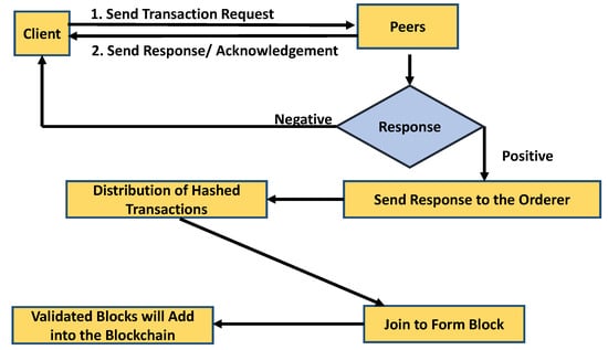 The transaction flow of hyperledger fabric with three endorsing peers and one committing peer will occur as per the convenience of protecting data confidentiality in the transaction. The chaincode references the data collection. Figure 2 explains the transaction flow. The client application submits a proposal request to invoke a chaincode function to endorsing peers that are part of approved organizations. The endorsing peers simulate the dealing and store the non-public information in a temporary data store and send the proposal response back to the client []. The response consists of the supported read/write set and a hash of keys. The client application submits the transaction to the ordering service. The hashed transaction gets added to the block and is distributed among peers. The peers will validate the data by checking whether they can access the data during the commit time. If they have the authority to do so, the peers will check in the temporary data store whether their data have already been received []. If not, they will pull the data from their peers and validate the data. After validation, the data’s copy is moved to private storage and deleted from the temporary storage.